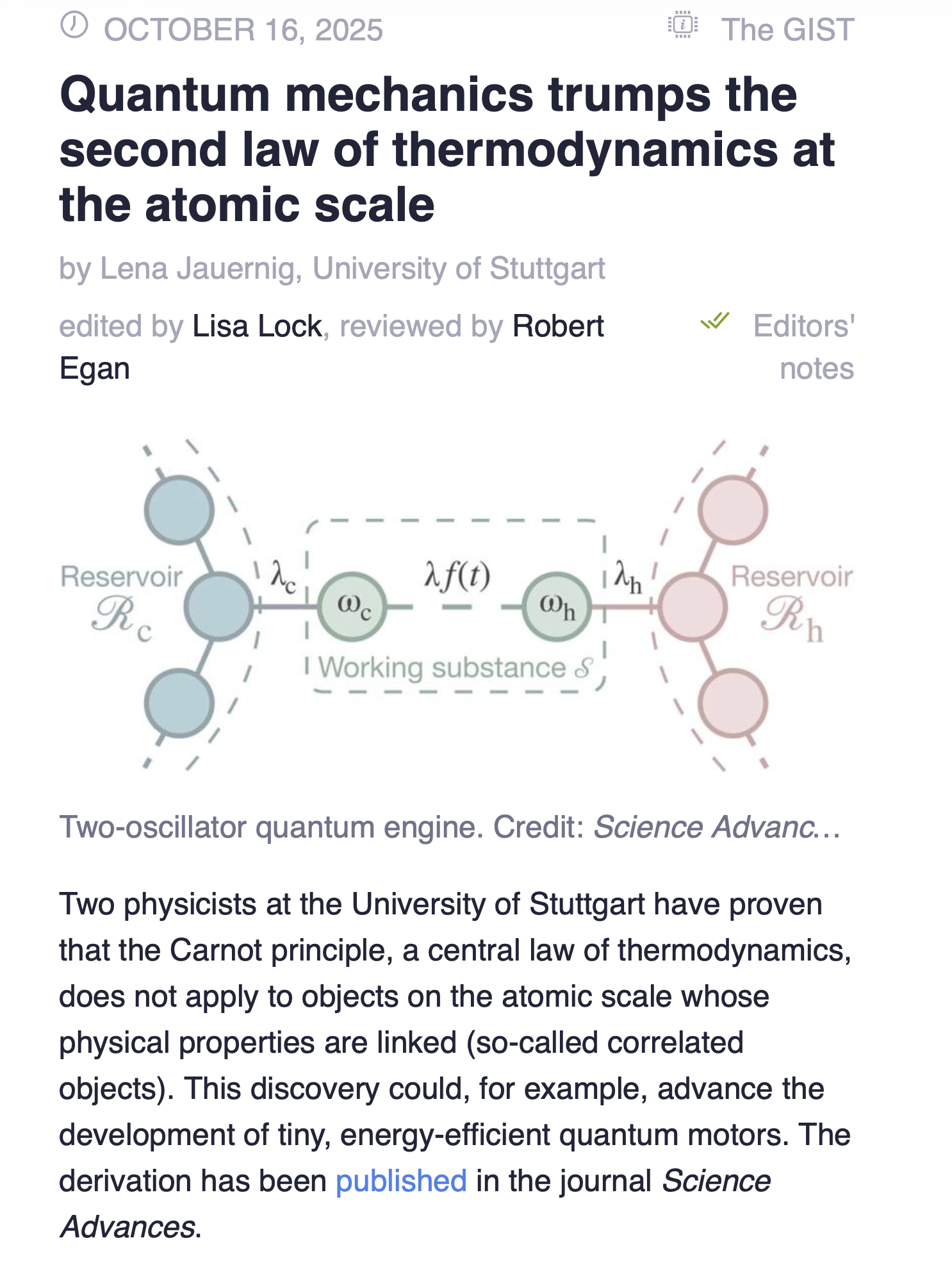 RECENT SCIENCE IN THE NEWS Quantum mechanics trumps the second law of thermodynamics at the atomic scale https://phys.org/news/2025-10-quantum-mechanics-trumps-law-thermodynamics.html